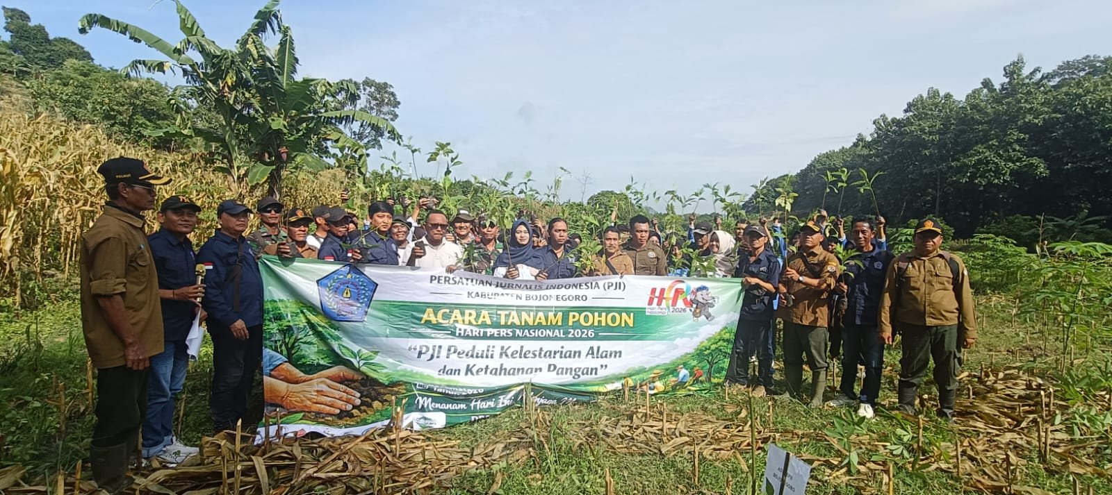 BOJONEGORO – Narasiplus.my.id-Dalam rangka memperingati Hari Pers Nasional (HPN) 2026, Persatuan Jurnalis Indonesia (PJI) Kabupaten Bojonegoro menggelar aksi peduli lingkungan dengan melakukan penanaman 600 bibit pohon produktif di lahan seluas 1,5 hektare di kawasan Hutan RPH Sukun Petak 164, Dusun Sukun, Desa Sambungrejo, Kecamatan Gondang, Kamis (12/2/2026).